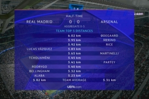 体育资讯4月17日讯 欧冠1/4决赛次回合,皇马主场暂时0-0战平阿森纳,阿森纳3将跑动位列上半场前三。