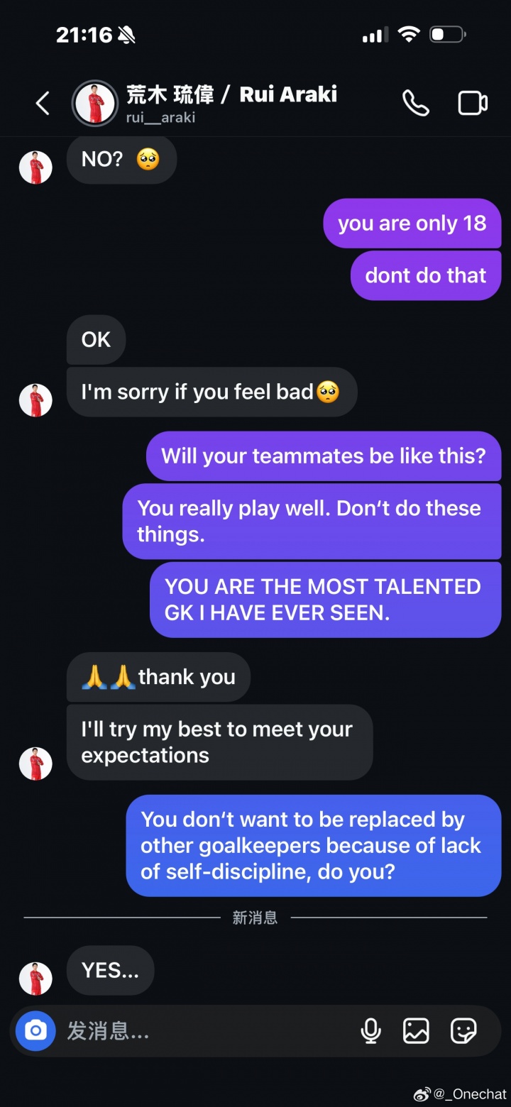 微博账号为“_Onechat”的网友此前爆料,称自己在INS遭遇日本U23门将荒木琉伟性骚扰,遭要性感照片+想发生性关系。之后她又在社媒发文进行了解释。