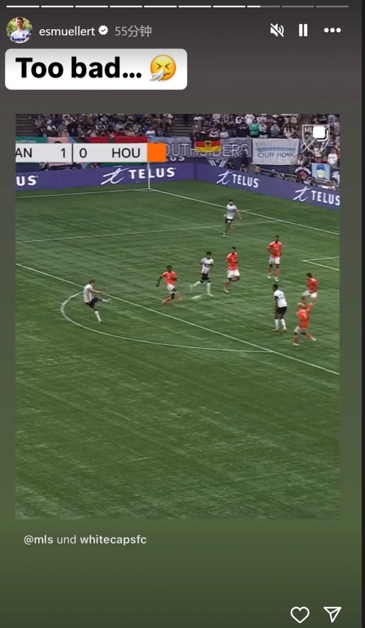 穆勒远射破门遭判无效 社交媒体发文直呼遗憾 xiaoqiao 2025年08月20日 23:29 71 0 美职联最新战报:8月18日温哥华白浪与休斯顿迪纳摩1-1握手言和。新援穆勒完成俱乐部首秀,一记精彩远射因越位被判无效。赛后穆勒在社交媒体发布进球视频,遗憾表示:"差之毫厘。"